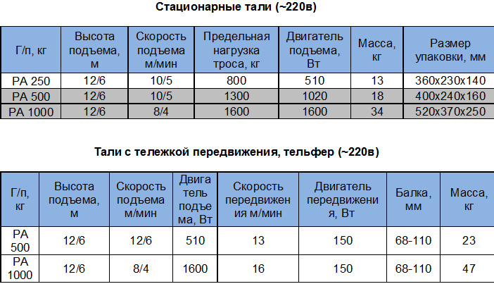 По грузоподъемности, тали РА тоже различаются и позволяют поднимать грузы от 100 до 1000 кг. Причем, здесь нужно учитывать, что у тали есть два крюка и два режима работы.